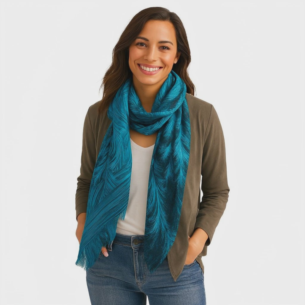 Inspired by the frozen patterns of winter, the micromodal Blue Ice Scarf swirls with feathered fractal-like designs in turquoise and gray. A modern, artistic accessory for year-round wear.