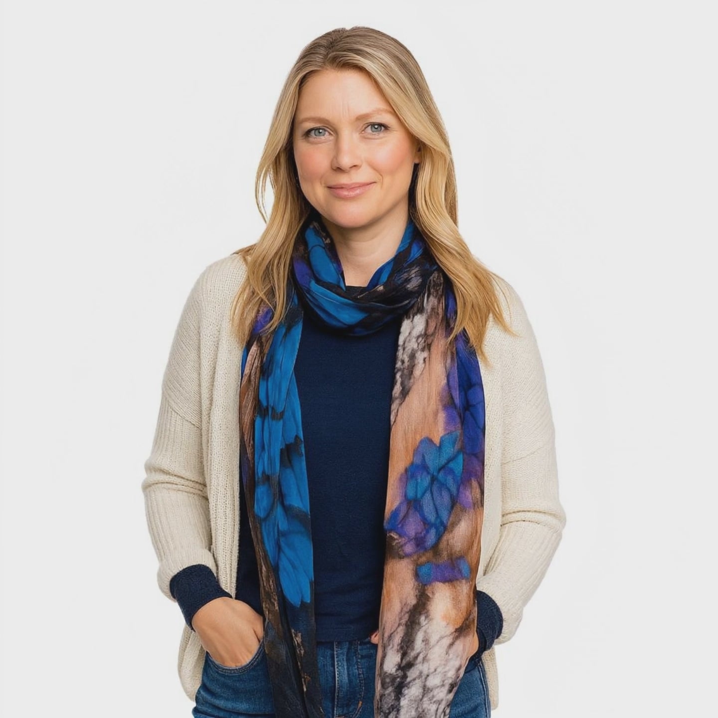 Alive with motion, the micromodal Butterflies Scarf in cobalt features layered wing patterns in deep blues and greens. Light, airy, and endlessly versatile.