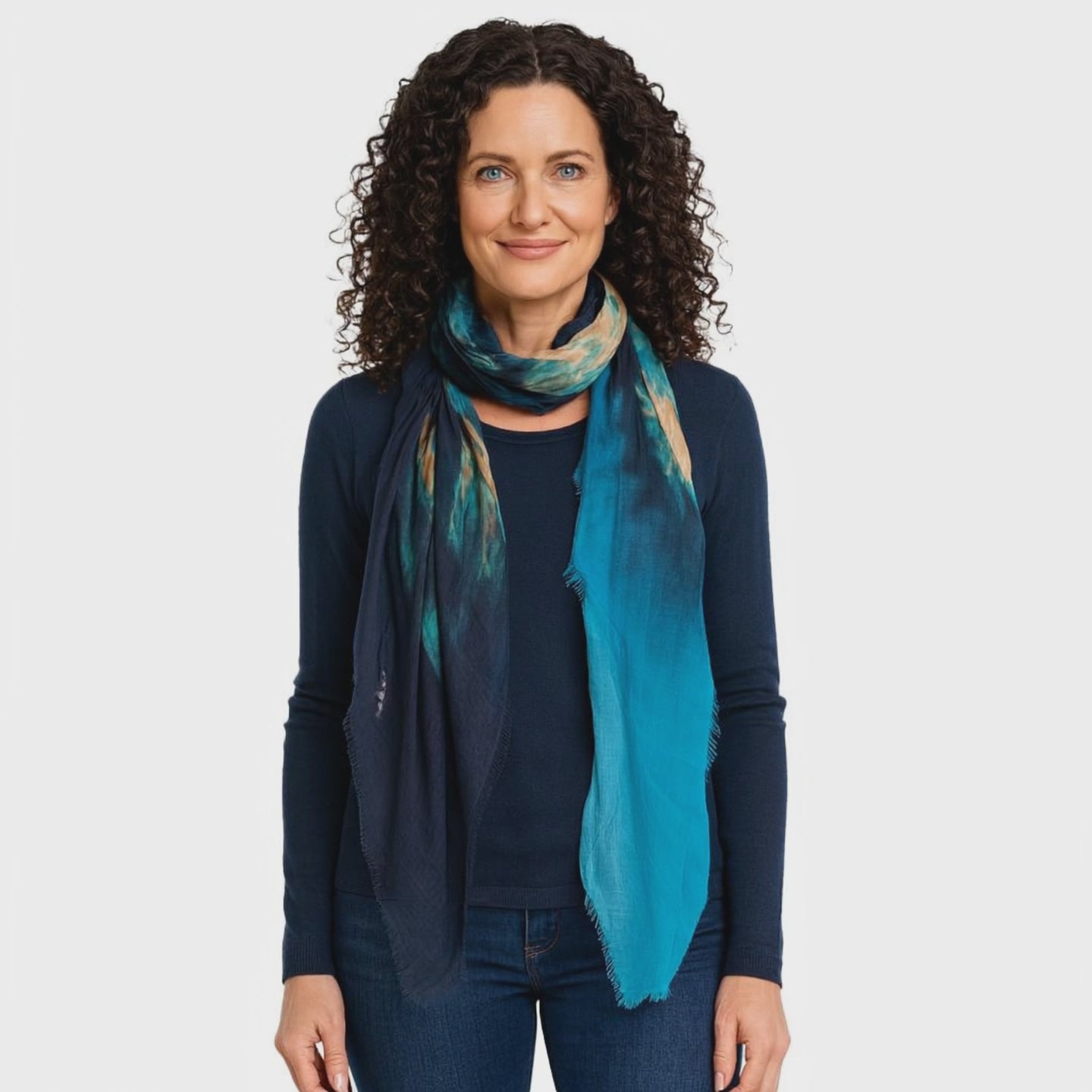 Mesmerizing and ethereal, the micromodal Jellyfish Bloom scarf floats with radiant jewel tones and fluid underwater beauty. A statement piece for ocean dreamers.