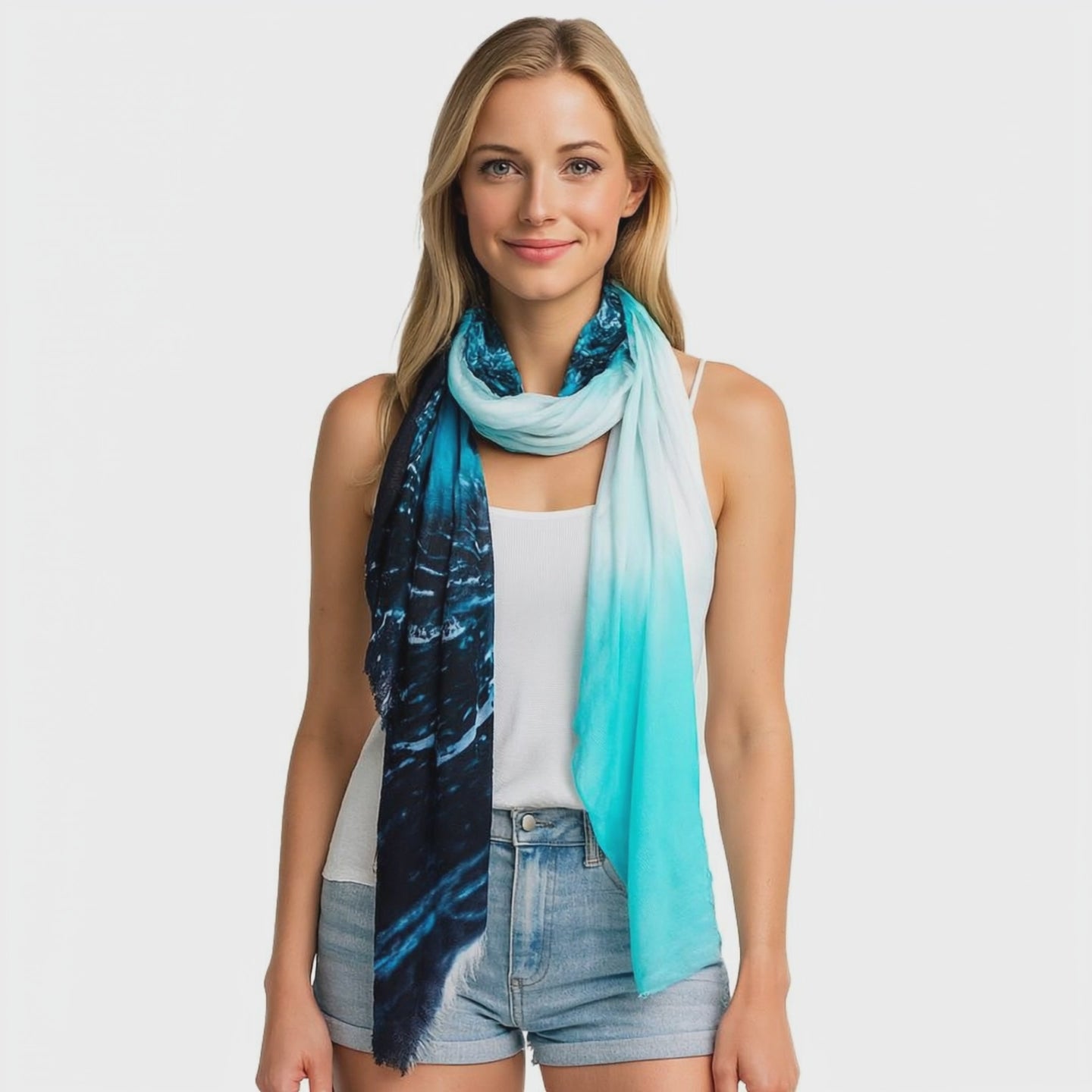 Feel the rush of the surf with the micromodal Ocean Wave scarf, a powerful print of turquoise swells frozen in motion. Bold, energizing, and endlessly coastal.